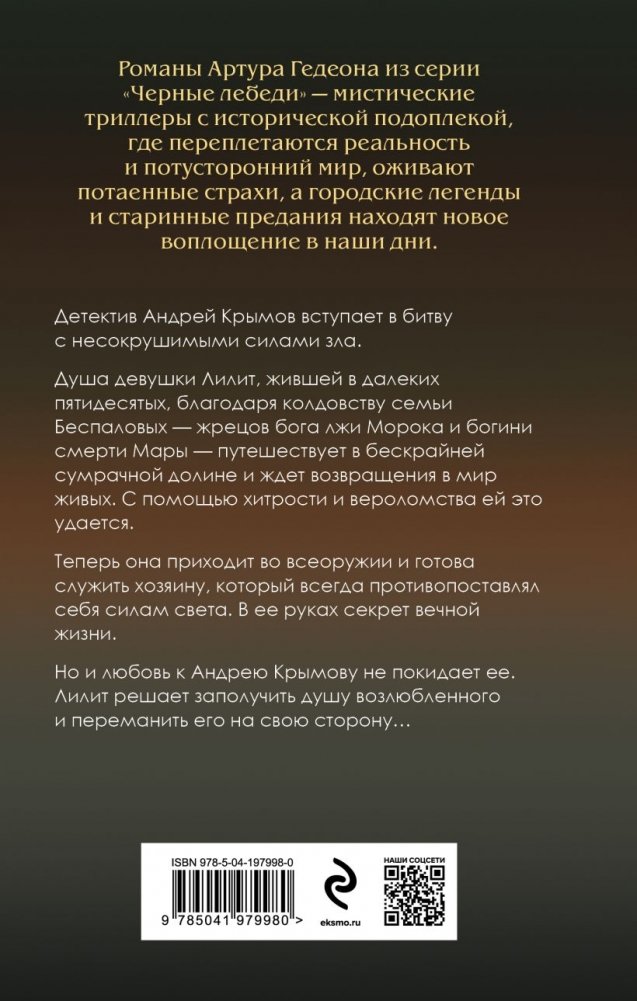 Отважный детектив Андрей Крымов вступает в битву с несокрушимыми силами зла. Душа девушки Лилит, жившей в далеких пятидесятых, благодаря колдовству семьи Беспаловых — жрецов бога лжи Морока и богини смерти Мары — путешествует в бескрайней сумрачной долине и ждет возвращения в мир живых. С помощью хитрости и вероломства ей это удается. Теперь она приходит во всеоружии и готова служить хозяину, который всегда противопоставлял себя силам света. В ее руках секрет вечной жизни. Но и любовь к Андрею Крымову не покидает ее. Лилит решает заполучить душу возлюбленного и переманить его на свою сторону…