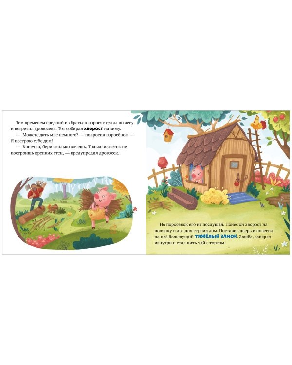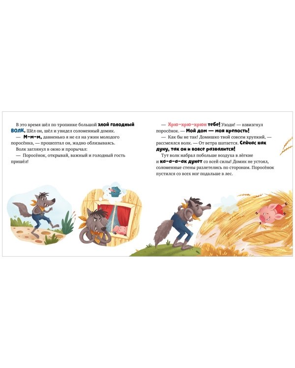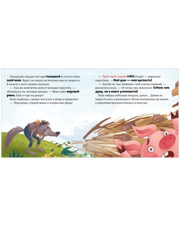 Однажды три поросёнка отправились в лес, чтобы построить собственные домики. Вскоре за ними погнался большой злой волк! Смогут ли поросята перехитрить его? Игры и задания в конце книги!