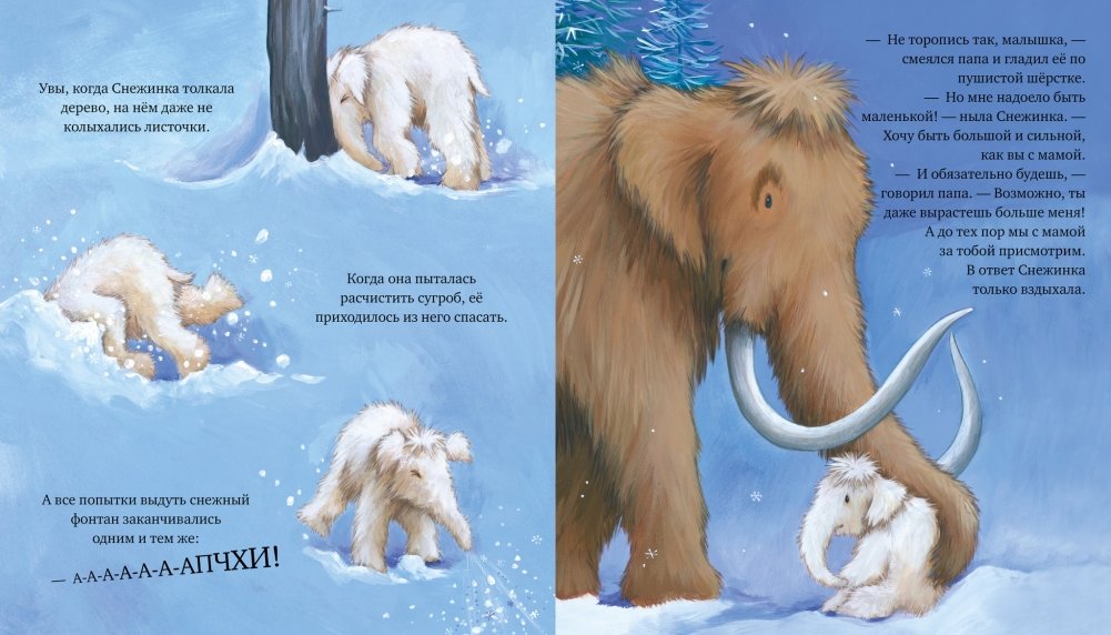Эта история, рассказанная волшебным, понятным малышу языком, познакомит вас с любознательным мамонтенком Снежинкой. Снежинка хочет быть такой же сильной и большой, как мама и папа. Ей просто не терпится стать взрослой и самой расчищать снежные завалы и пускать фонтаны из хобота. Увы, она пока не умеет делать все то, что умеют взрослые. Чтобы утешить дочку и придать ей веры в свои силы, папа мамонт решает показать Снежинке, что он тоже был маленьким.