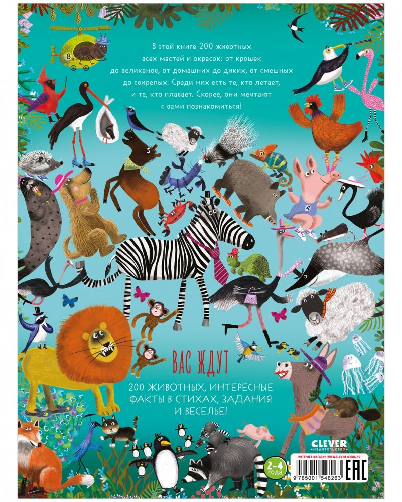 На страницах ребенка ждут 200 веселых животных всех мастей и окрасок: от крошек до великанов, от домашних до диких, от смешных до свирепых. Среди них есть те, кто летает, и те, кто плавает.