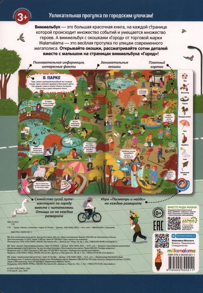 Виммельбух с окошками «Город» — это большая красочная книга-картинка, на страницах которой малыш сможет отправиться в настоящее путешествие по людному мегаполису. Окошки с интересными фактами дополняют сюжет иллюстраций весёлыми и необычными деталями. На каждой странице вас будет сопровождать семейство гусей, которые тоже живут в этом городе и превращают обычную прогулку по парку в весёлое приключение. Окошки имеют удобную выемку для детских пальчиков, чтобы ребёнку было удобно открывать их. Книга выполнена из плотного картона с ламинированной обложкой. Листайте книгу вместе с малышом, открывайте окошки и отправляйтесь на прогулку в чудесном настроении!