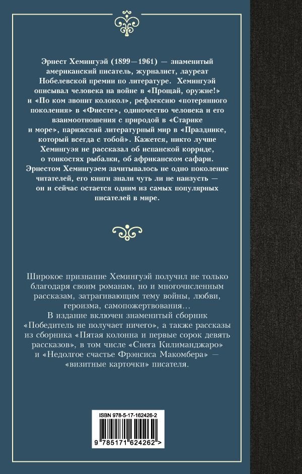 В издание включен знаменитый сборник "Победитель не получает ничего", а также рассказы из сборника "Пятая колонна и первые сорок девять рассказов", в том числе "Снега Килиманджаро" и "Недолгое счастье Фрэнсиса Макомбера" — "визитные карточки" писателя.
