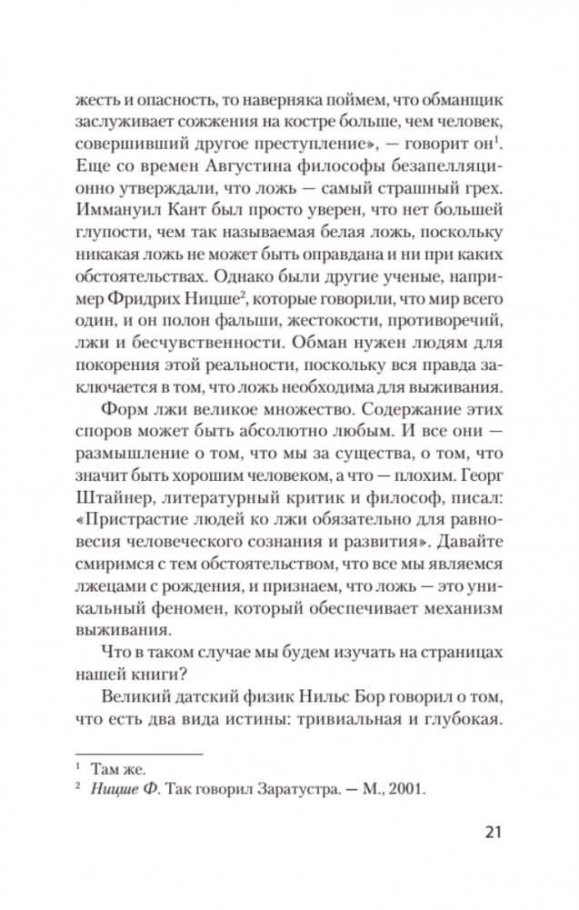Эта книга — одна из попыток сделать все возможное, чтобы лжи и обмана в нашей жизни стало меньше, а значит, кто-то стал счастливее. Перед вами практическое пособие по безынструментальной детекции лжи. В нем приведены не только советы, но и задания для самостоятельной отработки навыков. Когда уважаемый читатель выполнит хотя бы часть предложенных заданий и упражнений, ложь станет для него достаточно очевидной. Несмотря на то, что текст изложен очень доступно, в его основу положены многотысячные исследования, реальные полевые эксперименты и выборка, которой может позавидовать любой социальный психолог или психотерапевт, а главное — она абсолютно научна.