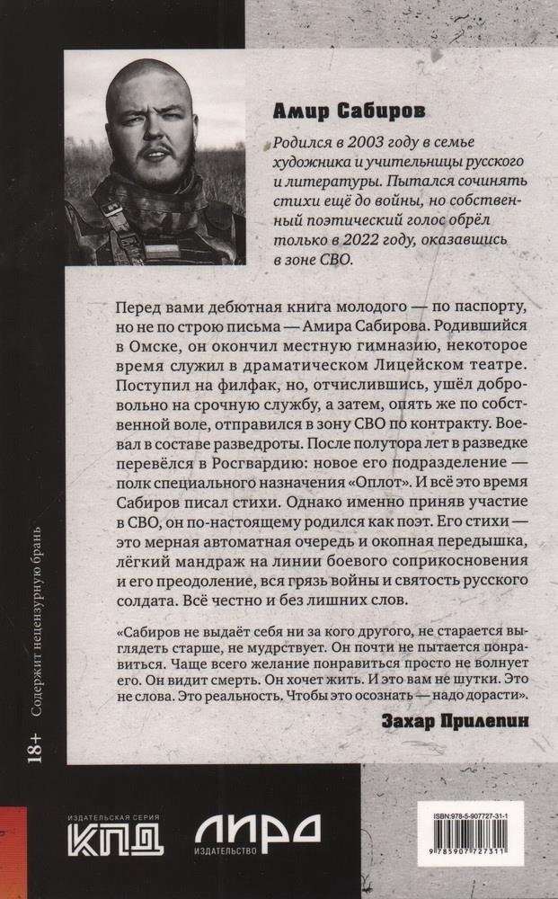 Родившийся в Омске, он окончил местную гимназию, некоторое время служил в драматическом Лицейском театре. Поступил на филфак, но, отчислившись, ушёл добровольно на срочную службу, а затем, опять же по собственной воле, отправился в зону СВО по контракту. Воевал в составе разведроты. После полутора лет в разведке перевёлся в Росгвардию: новое его подразделение — полк специального назначения «Оплот». И всё это время Сабиров писал стихи. Однако именно приняв участие в СВО, он по-настоящему родился как поэт. Его стихи — это мерная автоматная очередь и окопная передышка, лёгкий мандраж на линии боевого соприкосновения и его преодоление, вся грязь войны и святость русского солдата. Всё честно и без лишних слов.