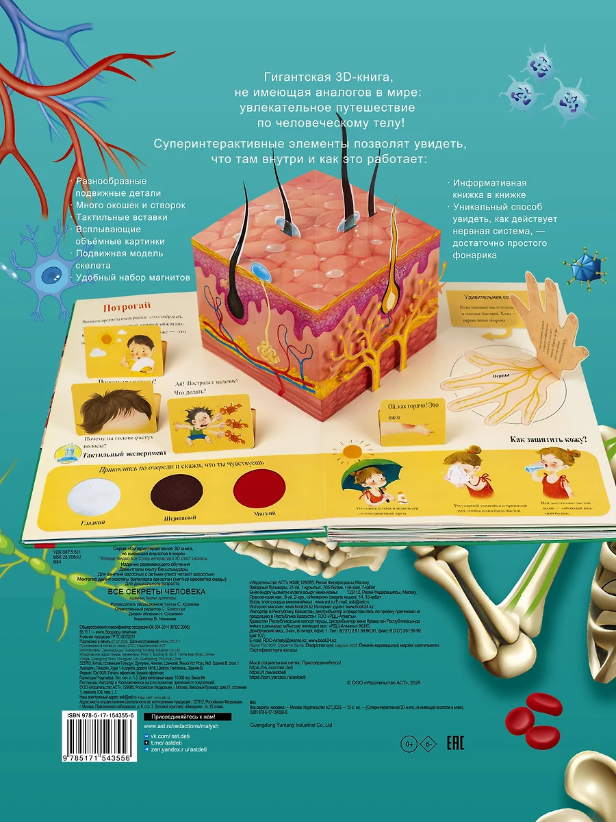 Это лучшая детская книга по анатомии — гигантская 3D-книга, не имеющая аналогов в мире: увлекательное путешествие по человеческому телу в интерактивном формате. Здесь есть всё! Суперинтерактивные элементы позволят увидеть, что там внутри и как это работает: разнообразные подвижные детали, много окошек и створок, тактильные вставки, всплывающие объемные картинки, подвижная модель скелета, удобный набор магнитов, информативная книжка в книжке, уникальный способ увидеть, как действует нервная система, — достаточно простого фонарика! Все ответы на вопросы детей о теле и прекрасный подарок для маленьких почемучек.
