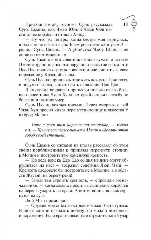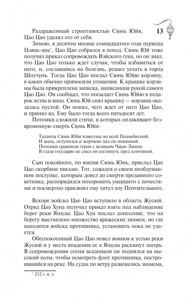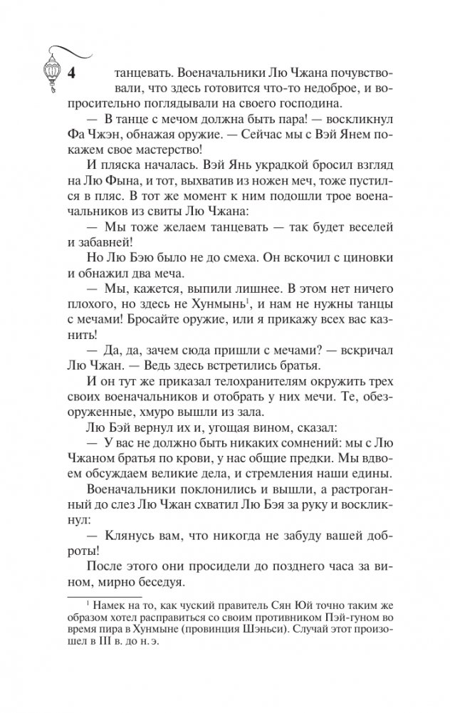Сочетая исторические хроники с легендами и мифами, Ло Гуань-чжун сплетает масштабное полотно с десятками сюжетных линий и сотнями действующих лиц. Кровопролитные сражения и закулисные битвы за власть, героические подвиги и любовные приключения — и все это на фоне одного из самых драматичных моментов в истории Китая, когда единая Ханьская империя распалась на три независимых государства, беспрерывно воюющих друг с другом.