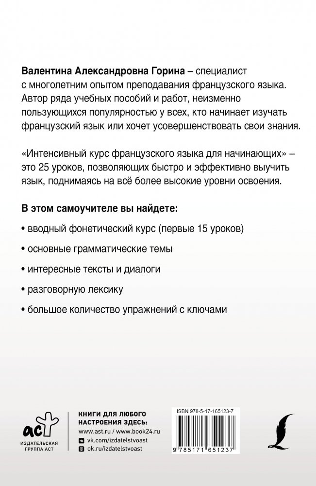 Книга состоит из 25 уроков и позволяет быстро и эффективно выучить язык, поднимаясь на всё более высокие уровни освоения. В пособии даны базовые сведения по грамматике, включая основные времена французских глаголов. Этого объема достаточно, чтобы начать уверенно читать по-французски и общаться на бытовые темы. Особое внимание уделено особенностям французского произношения: фонетические разделы сопровождают читателя вплоть до 15-го урока. Большое количество упражнений (ключи к ним помещены в конце книги) помогает уверенно закрепить учебный материал. А тексты и диалоги способствуют быстрому усвоению лексики (списки новых слов с переводом есть в каждом из уроков).