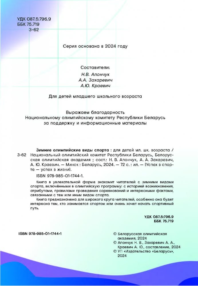 Книга в увлекательной форме знакомит читателей с зимними видами спорта, включёнными в олимпийскую программу: с историей возникновения, атрибутами, правилами проведения соревнований и интересными фактами, связанными с тем или иным видом спорта.