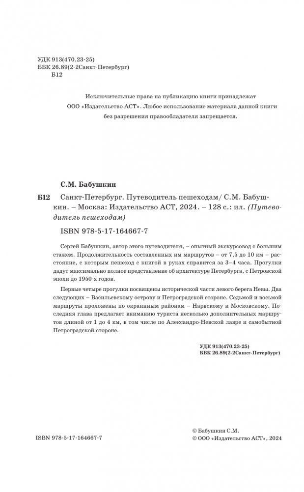 Сергей Бабушкин, автор этого путеводителя - опытный экскурсовод с семилетним стажем. Продолжительность сосотавленных им маршрутов - от 7,5 до 10 км – расстояние, с которым пешеход с книгой в руках справится за 3-4 часа. Прогулки дадут максимально полное представление об архитектуре Петербурга, с Петровской эпохи до 1950-х годов.