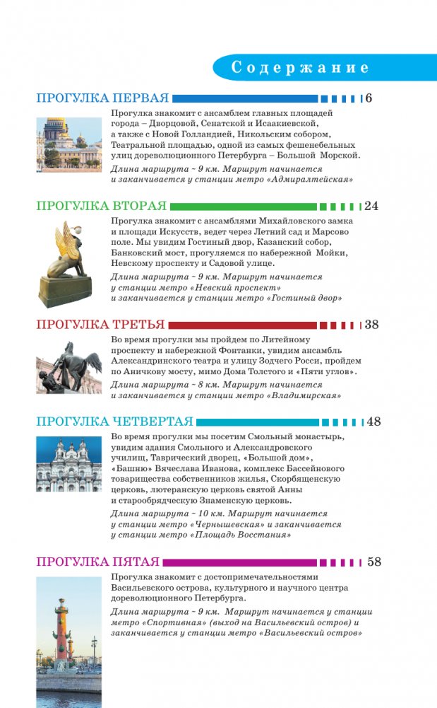 Первые четыре прогулки посвящены исторической части левого берега Невы. Два следующих – Васильевскому острову и Петроградской стороне. Седьмой и восьмой маршруты проложены по окраинным районам – Нарвскому и Московскому. Последняя глава предлагает вниманию туриста несколько дополнительных маршрутов длиной от 1 до 4 км, в том числе по Александро-Невской лавре и самобытному Петроградскому району.