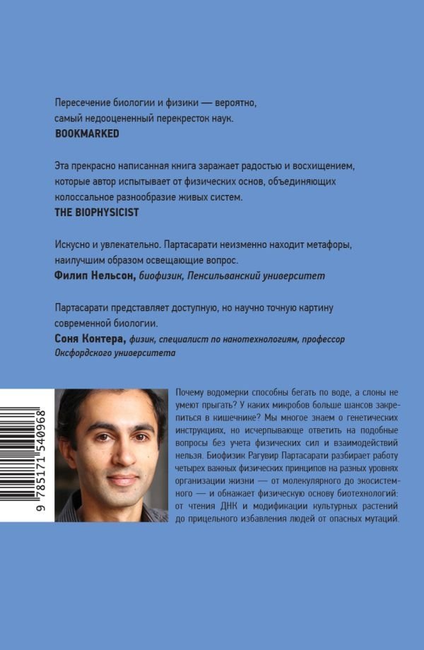 Биофизик Рагувир Партасарати объясняет, как четыре физических принципа — самосборка, регуляторные схемы, предсказуемая случайность и масштабирование — определяют структуру и поведение биологических систем, от укладки молекул белка и активности генов до судьбы бактерий в кишечном сообществе. Эти закономерности лежат в основе всего многообразия живой природы и позволяют развивать немыслимые прежде биотехнологии. Действие физических правил автор разбирает на массе примеров, включая упаковку вирусной ДНК, устройство мембран, закладку плана тела в эмбриогенезе, органы на чипе, редактирование генома, прионные болезни и муковисцидоз.