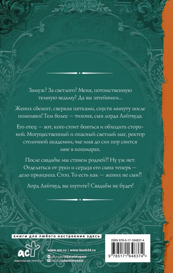 Замуж? За светлого? Меня, потомственную темную ведьму? Да вы затейники… Жених сбежит, сверкая пятками, спустя минуту после помолвки! Тем более — тихоня, сын лорда Лайтвуда. Его отец — вот, кого стоит бояться и обходить стороной. Могущественный и опасный светлый маг, ректор столичной академии, чье имя до сих пор снится мне в кошмарах. После свадьбы мы станем родней?! Ну уж нет. Отделаться от руки и сердца его сына теперь — дело принципа. Стоп. То есть как — жених не сын?! Лорд Лайтвуд, вы шутите? Свадьбы не будет!