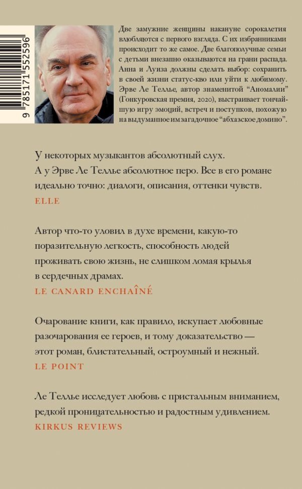 сорокалетия вынуждают Анну и Луизу сделать выбор: сохранить семью или уйти к любимому. Эрве Ле Теллье выстраивает тончайшую игру эмоций, слов и поступков, похожую на выдуманное им загадочное “абхазское домино”.
