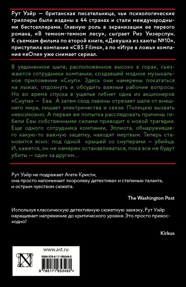 А затем сход лавины отрезает шале от внешнего мира, лишает электричества и связи. Полицию вызвать невозможно. А попытка расследовать причины гибели Евы собственными силами приводит к новой трагедии. Еще одного сотрудника компании, Эллиота, обнаружившего какую-то важную зацепку, находят мертвым.