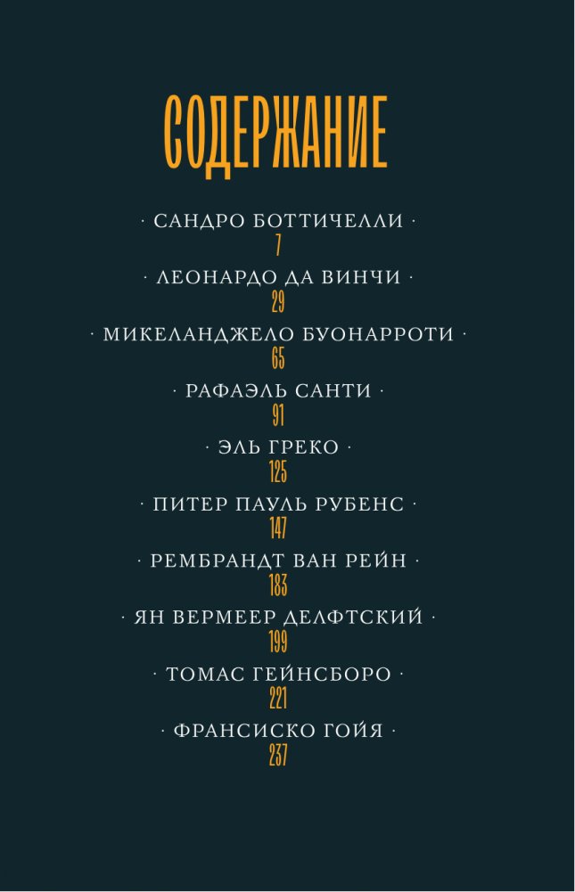 В настоящей книге читатель встретится с бессмертными творениями Сандро Боттичелли, Леонардо да Винчи, Микеланджело Буонарроти, Рафаэля Санти, Эль Греко, Питера Пауля Рубенса, Рембрандта ван Рейна, Яна Вермеера Делфтского, Томаса Гейнсборо, Франсиско Гойи. Пройдет по страницам их жизни, почувствует их гений и откроет заново блистательные произведения живописи.