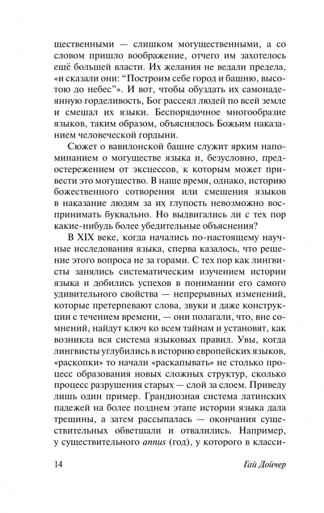 Кто все-таки придумал столь сложную и многоуровневую систему, как язык? Можно ли проследить происхождение его структуры? Или он имеет божественное происхождение и был ниспослан Адаму в готовом виде? Как язык определяет образ жизни человека и судьбу народа? Почему одни языки сильно меняются со временем, а другие остаются практически неизменными? Какую роль играют метафоры в формировании языковых структур? В чем суть такого масштабного феномена, как отличие порядка слов в разных языках?