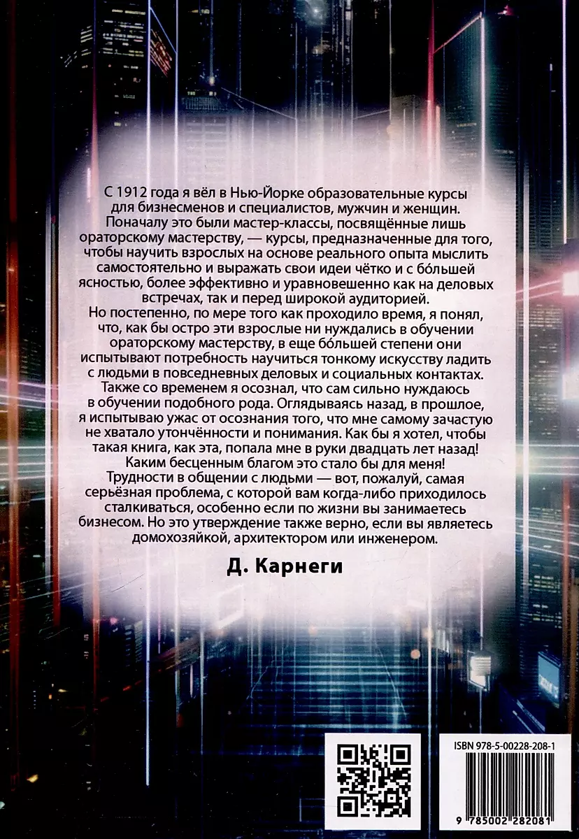 Эта книга — выдающееся произведение известного американского психолога, лектора и педагога Дейла Карнеги (1888–1955), впервые изданная в 1936 году и с тех пор выдержавшая множество переизданий (оригинальное название — “How to Win Friends and Influence People”). В ней в популярной и доступной форме, со множеством примеров, взятых из реальной жизни, рассказывается о том, каким образом строить общение с людьми на работе, в семье и социуме так, чтобы сохранять с ними хорошие отношения и добиваться своих целей. Автор даёт простые и понятные рекомендации как во время разговора расположить к себе собеседника, избежав ненужных споров; как заставить партнёра на переговорах обратить внимание на ваши аргументы и принять вашу точку зрения; как увлечь за собой подчинённых и стать лидером какого-то проекта. Издание предназначено для широкого круга читателей.
