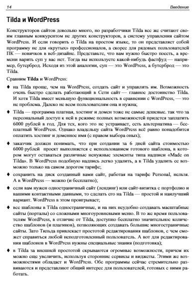 Подробно рассмотрена работа с конструктором сайтов Tilda, позволяющим создавать сайты любой сложности из готовых блоков и шаблонов без программирования. Приведены рекомендации по использованию панели разработчика и советы по оптимальным настройкам. Даны пошаговые инструкции для создания одностраничного сайта-визитки, лендинга, многостраничного сайта, сайта-портфолио и интернет-магазина. Описан принцип работы с Zero block, рассказано о публикации меню, галереи изображений, об использовании форм и виджетов, добавлении анимации и видео . Рассмотрена работа со шрифтами, регистрация и подключение домена, добавление SSL-сертификата. Отдельное внимание уделено интеграции интернет-магазина с платежными системами. Читатели узнают, как правильно организовать работу над сложными проектами и разрабатывать сайты на заказ.