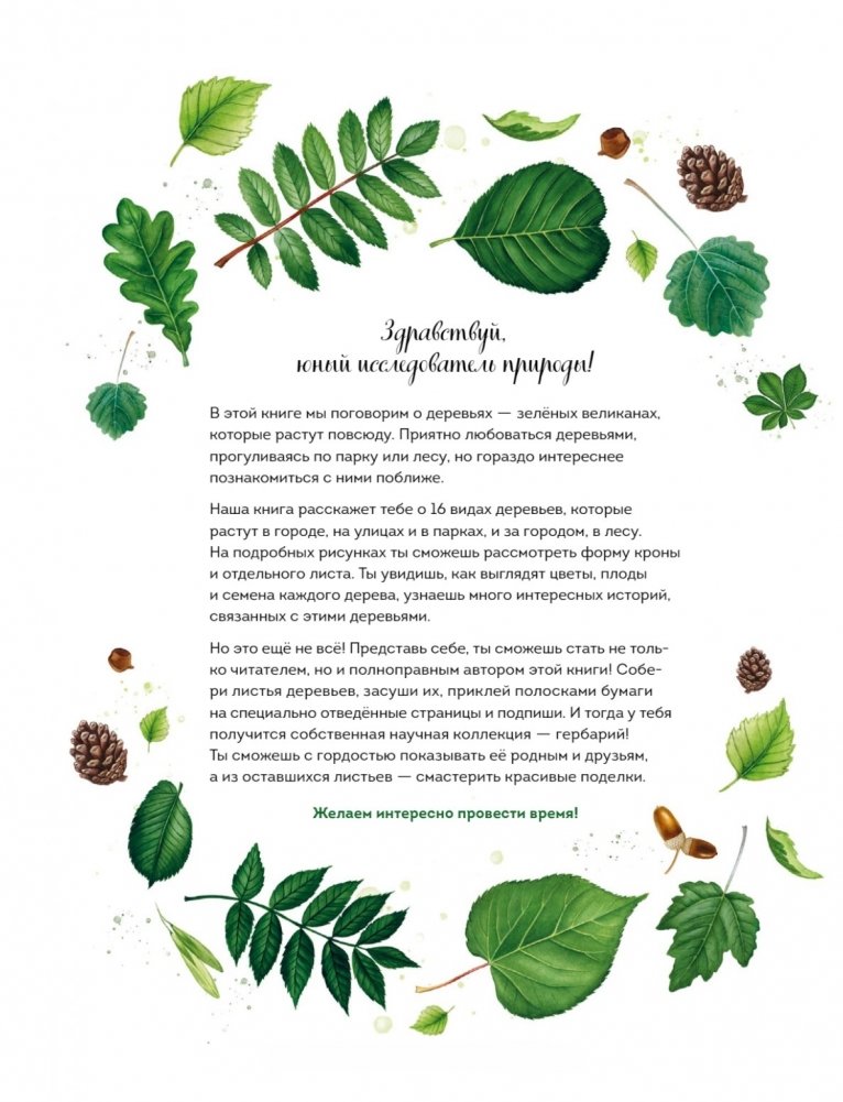 Книга-гербарий знакомит ребёнка с деревьями средней полосы России и предлагает сохранить их листья здесь же, между страницами книги. Тексты, написанные учёным-ботаником, и реалистичные акварельные иллюстрации откроют ребёнку мир деревьев, научат внимательнее относиться к природе и искренне восхищаться её красотой. Помимо интересных фактов о деревьях, в книге имеются подробные описания, как правильно собирать и засушивать листья для гербария, а также идеи игр и поделок из листьев. На подробных рисунках можно рассмотреть форму кроны и отдельного листа. Увидеть, как выглядят цветы, плоды и семена каждого дерева, узнать много интересных историй, связанных с этими деревьями. Но это ещё не всё. Можно стать не только читателем, но и полноправным автором этой книги. Собрать листья деревьев, засушить их, приклеить полосками бумаги на специально отведённые станицы и подписать. И тогда получится собственная научная коллекция — гербарий!