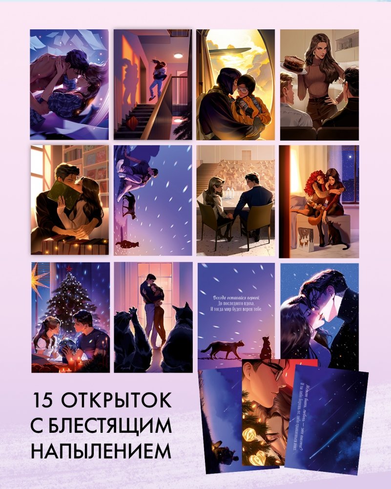 Пятнадцать открыток упакованы в плотный иллюстрированный футляр, который защитит их от повреждений. На открытках арты к подарочному изданию романа «Влюбленная ведьма» с мерцающим напылением, а обратная сторона отлично подходит для заметок, пожеланий и признаний.