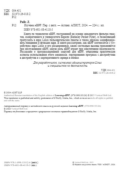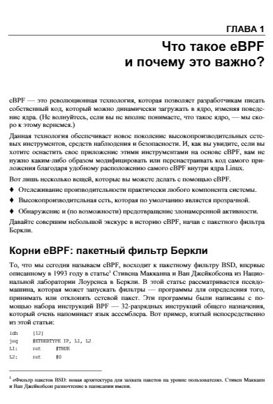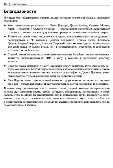 Книга по технологии eBPF, построенной на основе знаменитого фильтра пакетов, изобретённого в университете Беркли (Berkeley Packet Filter), и позволяющей пропускать в ядро Linux пользовательские пакеты и таким образом модифицировать поведение и функции ядра. В книге рассмотрено, как eBPF соотносится с устройством ядра Linux и его расширениями, какие системные вызовы применяются при обслуживании eBPF, какую роль eBPF играет при обеспечении безопасности. Рассказано о программировании модулей для eBPF, объяснены практические аспекты использования этого механизма: портирование программ с дистрибутива в дистрибутив и с корпоративного сервера в облако.