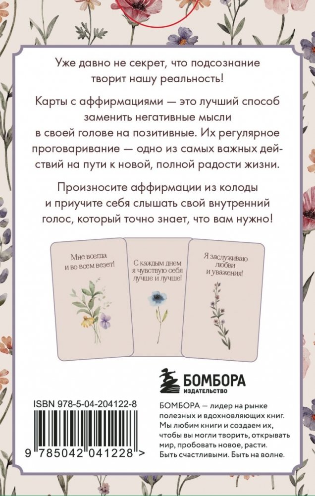 Уже давно не секрет, что подсознание — творит нашу реальность! Карты с аффирмациями — это лучший способ заменить негативные мысли в своей голове на позитивные. Их регулярное проговаривание одно из самых важных действий, на пути к новой, полной радости, жизни. Произносите аффирмации из колоды и приучите себя слышать свой внутренний голос, который точно знает, что вам нужно!
