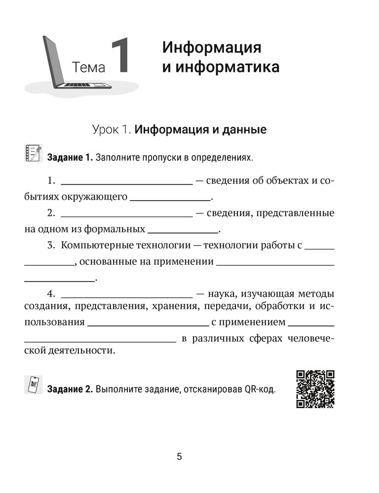 Рабочая тетрадь составлена в соответствии с учебной программой по информатике и содержит письменные задания по теории, практические задания для выполнения на компьютере и QR-коды на интерактивные задания по каждой изучаемой теме. Материал, представленный в пособии, направлен на формирование системного мышления и активизацию творческого потенциала, развитие умения находить нестандартные способы получения, осмысления и обработки информации.