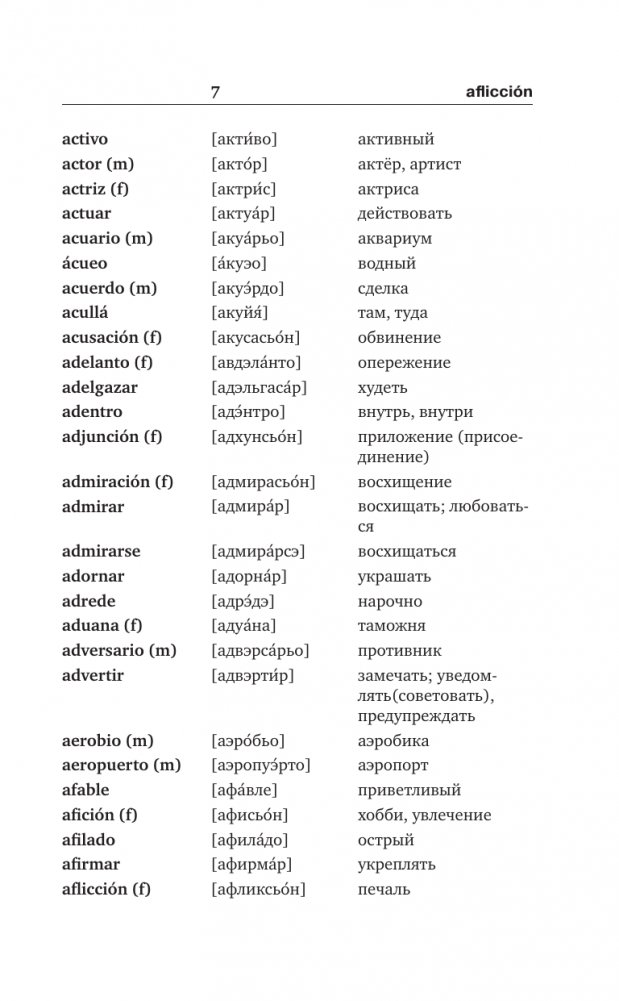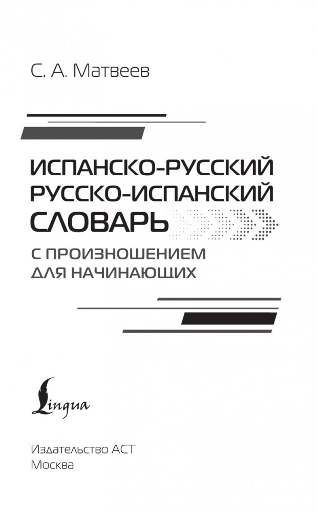 Этот словарь подготовлен автором популярных самоучителей и учебных пособий Сергеем Матвеевым. Испанско-русская и русско-испанская части содержат примерно по 4 000 наиболее употребительных слов. Все слова снабжены транскрипцией русскими буквами, причем и в русско-испанской части также дается произношение испанских слов.