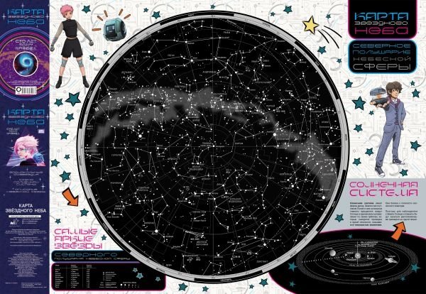 Звёзды на карте ранжированы по видимой звёздной величине. Даны названия самых ярких звёзд и условные очертания всех 88 созвездий. Приведёны краткие сведения о Солнечной системе, небесной сфере, звёздных координатах, эклиптике и зодиакальном круге. Размеры карты в сложенном виде 110х227 мм. Карта будет полезна для всех, кто интересуется астрономией. А яркие и красочные изображения героев фильма "Сто лет тому вперед" превращают полезную и насыщенную информацией карту в красочный постер, который можно разместить на стене. Из какой галактики Алиса, как космеон попал в руки к Коле - изучая карту звездного неба, вспоминай фильм и его героев, фантазируй. Твое виртуальное путешествие по созвездиям сможет вместить восхищение, удивление и массу других положительных эмоций, связанных с изучением карты звездного неба.