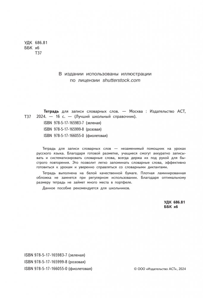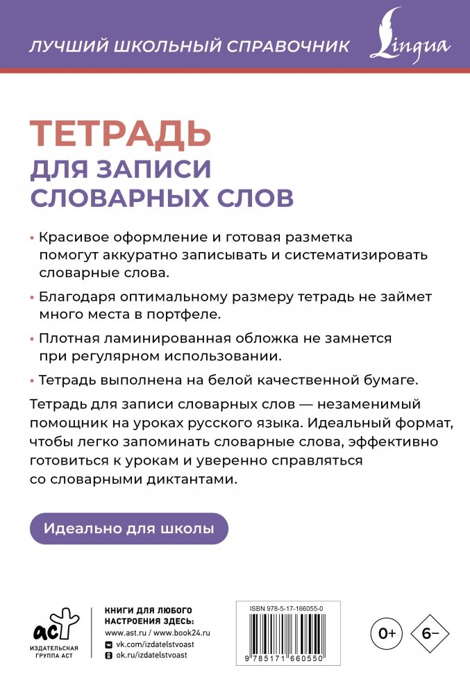 Тетрадь для записи словарных слов — незаменимый помощник на уроках русского языка. Благодаря готовой разметке, учащиеся смогут аккуратно записывать и систематизировать словарные слова, всегда держа их под рукой для быстрого повторения. Это позволит легко запоминать словарные слова, эффективно готовиться к урокам и уверенно справляться со словарными диктантами.