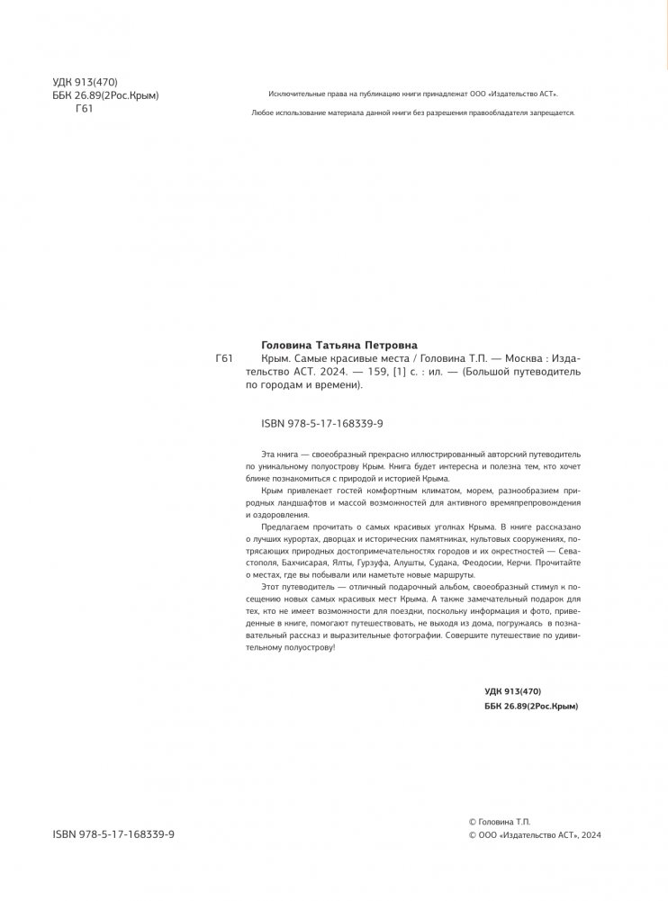 Этот путеводитель — отличный подарочный альбом, своеобразный стимул к посещению новых самых красивых мест Крыма. А также замечательный подарок для тех, кто не имеет возможности для поездки, поскольку информация и фото, приведенные в книге, помогают путешествовать, не выходя из дома, погружаясь в познавательный рассказ и выразительные фотографии. Совершите путешествие по удивительному полуострову!