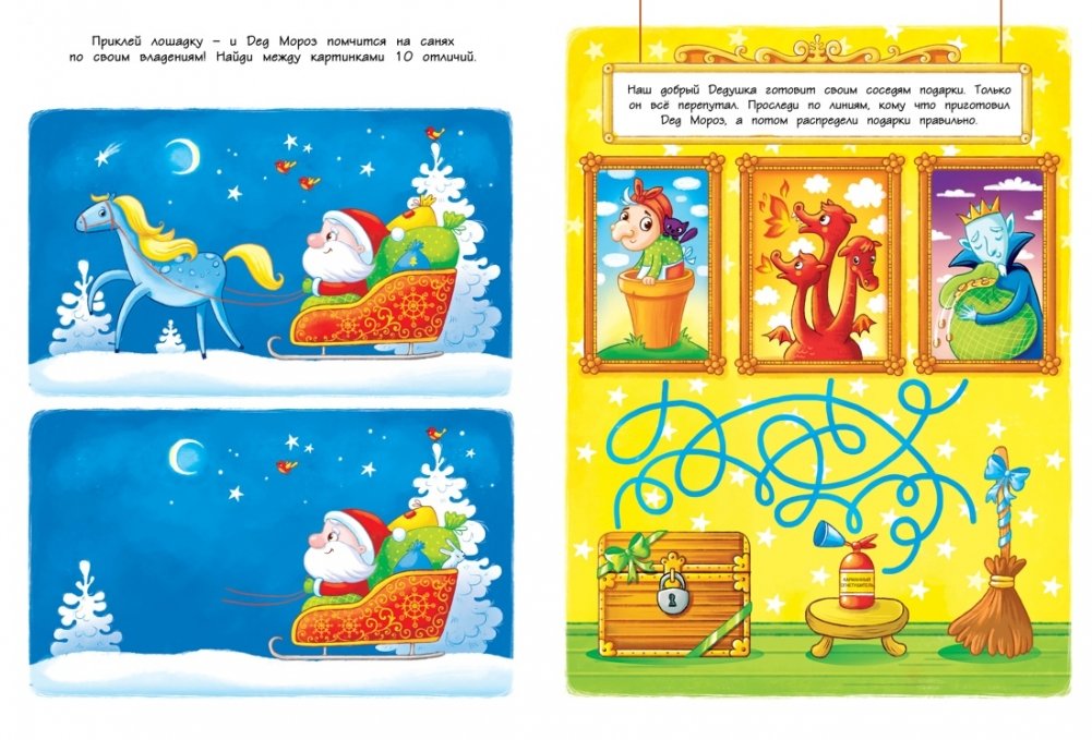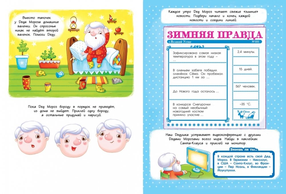 Новый год – время волшебства и сюрпризов! А кто может создать отличное настроение лучше, чем Дед Мороз? Однако у Деда Мороза зимой так много дел: прочитать письма, упаковать подарки и развезти их, смастерить игрушки для ёлки, устроить видеоконференцию с Санта-Клаусом… и много-много чего ещё. Но ты можешь помочь ему прямо сейчас! Достаточно взять цветные карандаши и открыть эту книжку. Тебя ждут игры с яркими наклейками, раскраски и рисовалки, путаницы, задания-считалки и поделка, а также красочные маски для весёлого праздника!