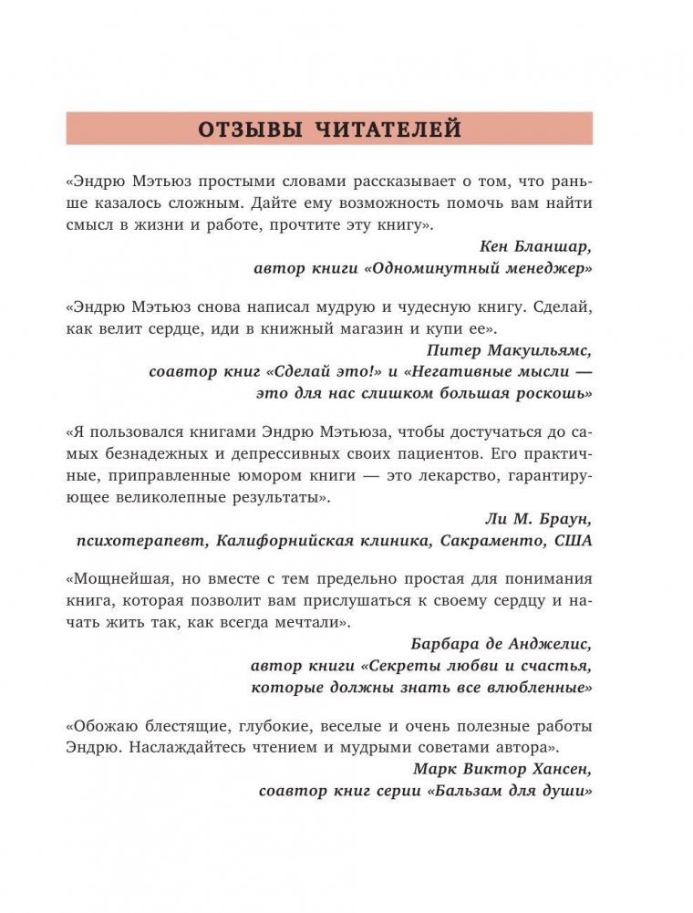 Книга австралийского психолога, художника, писателя Эндрю Мэтьюза - лучшее лекарство от стресса, депрессии, просто плохого настроения. Изящный остроумный текст в сопровождении "фирменных" рисунков автора поможет вам добиться успеха в любви, дружбе, карьере, учебе и т.д. Вы поймете, что любая проблема имеет решение, а если решение запаздывает, все равно можно идти по жизни легко и радостно. Четкие и нестандартные рекомендации автора подкрепляются реальными историями, которые можно "примерить" на себя и лишний раз убедиться, какая все-таки классная штука - жизнь!