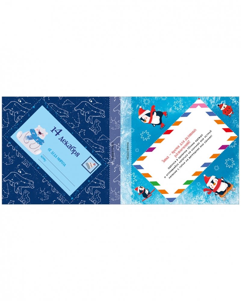 Каждая страничка адвент-календаря — это одно из писем Дедушки Мороза, в котором ребенка ждут задания, рецепты, инструкции для поделок и многое другое. Игра начинается 1 декабря. Всё, что нужно сделать взрослым, — аккуратно отрезать нужную страничку, сложить по линиям сгиба, заклеить наклейкой и спрятать секретное послание под подушку.