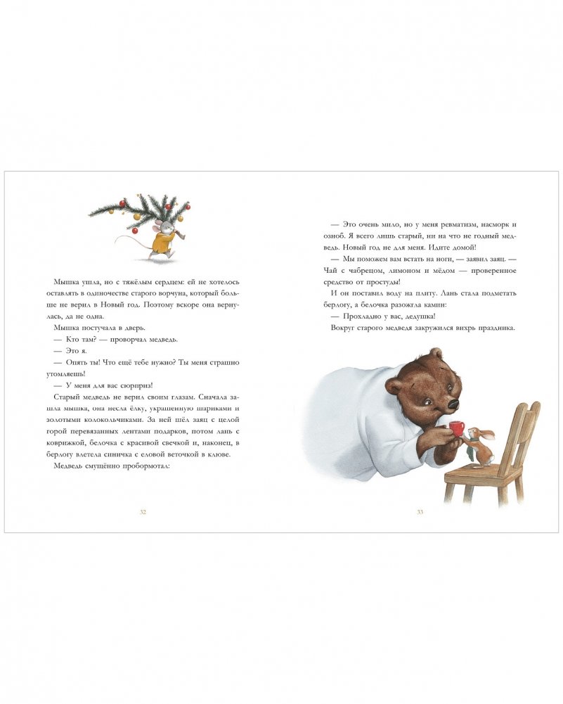 «Старый медведь не верил своим глазам. Сначала зашла мышка, она несла елку, украшенную шариками и золотыми колокольчиками. За ней шел заяц с целой горой перевязанных лентами подарков, потом лань с коврижкой, белочка с красивой свечкой, и, наконец, в берлогу влетела синичка с еловой веточкой в клюве».