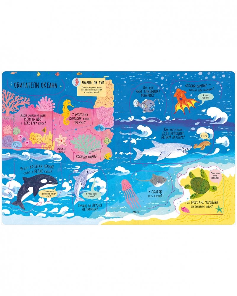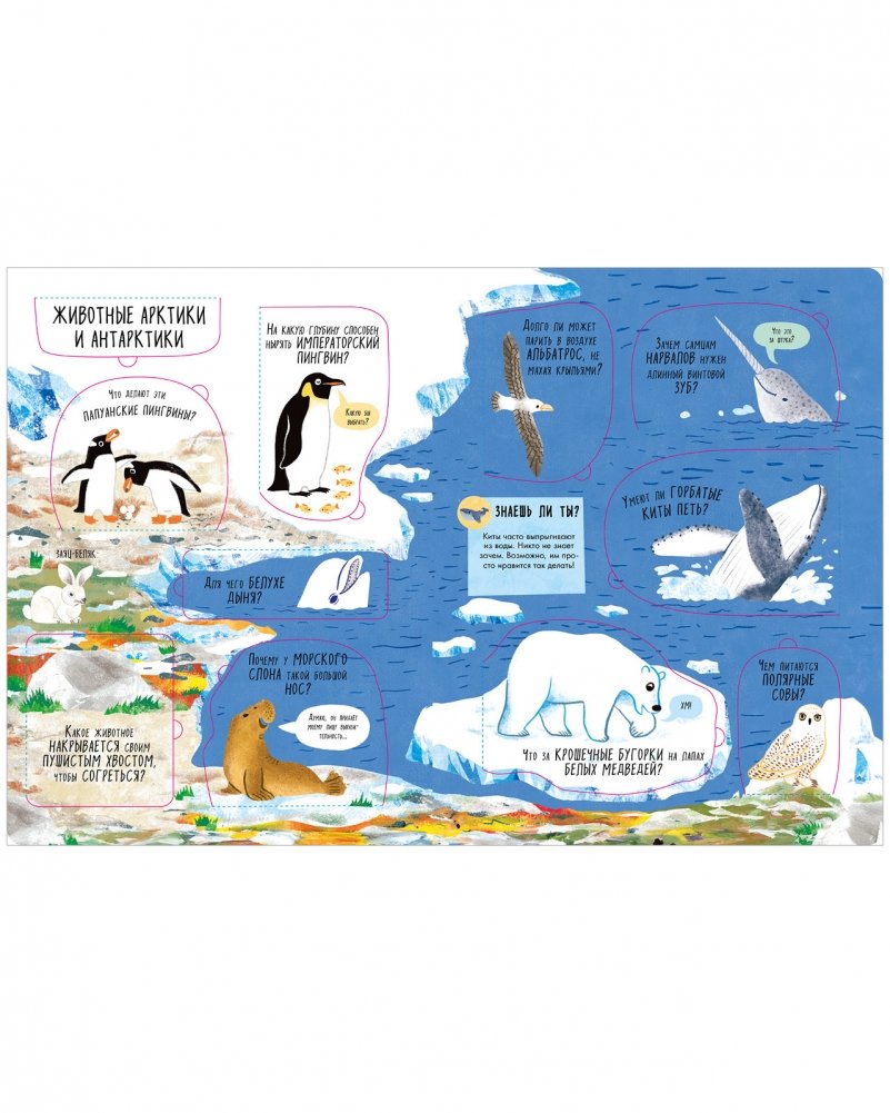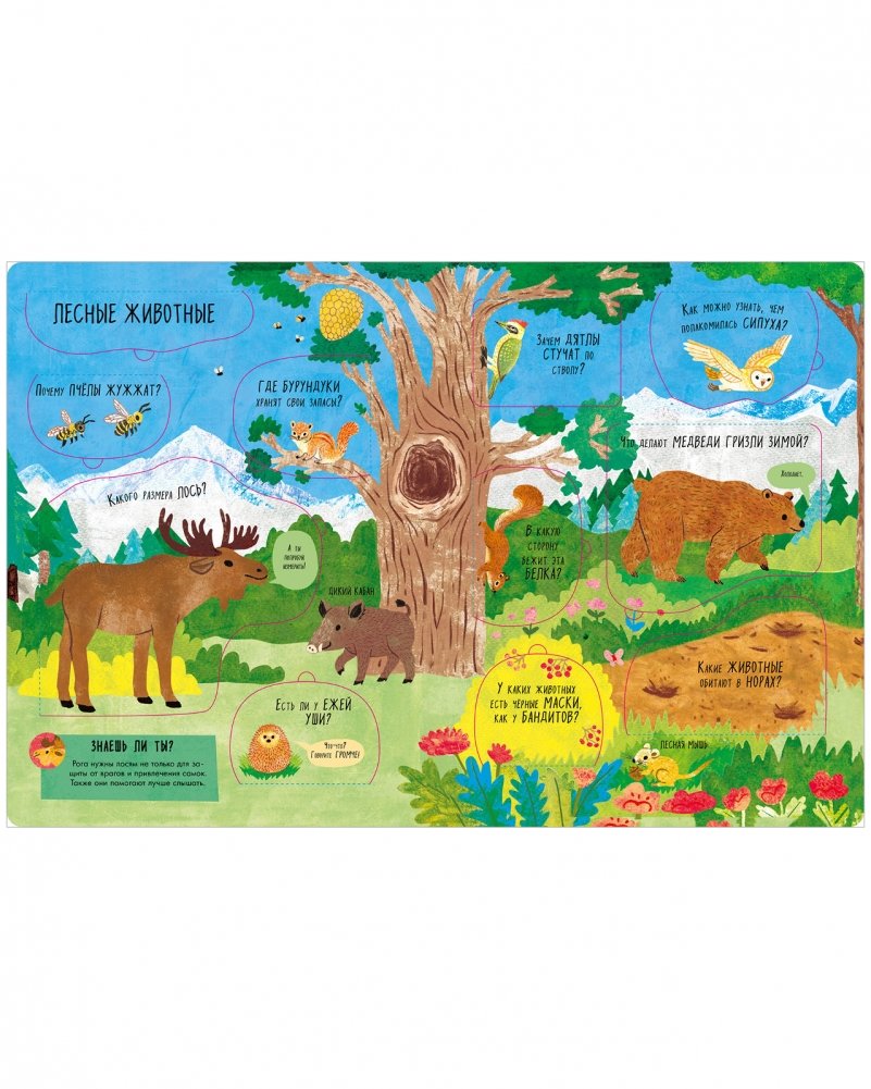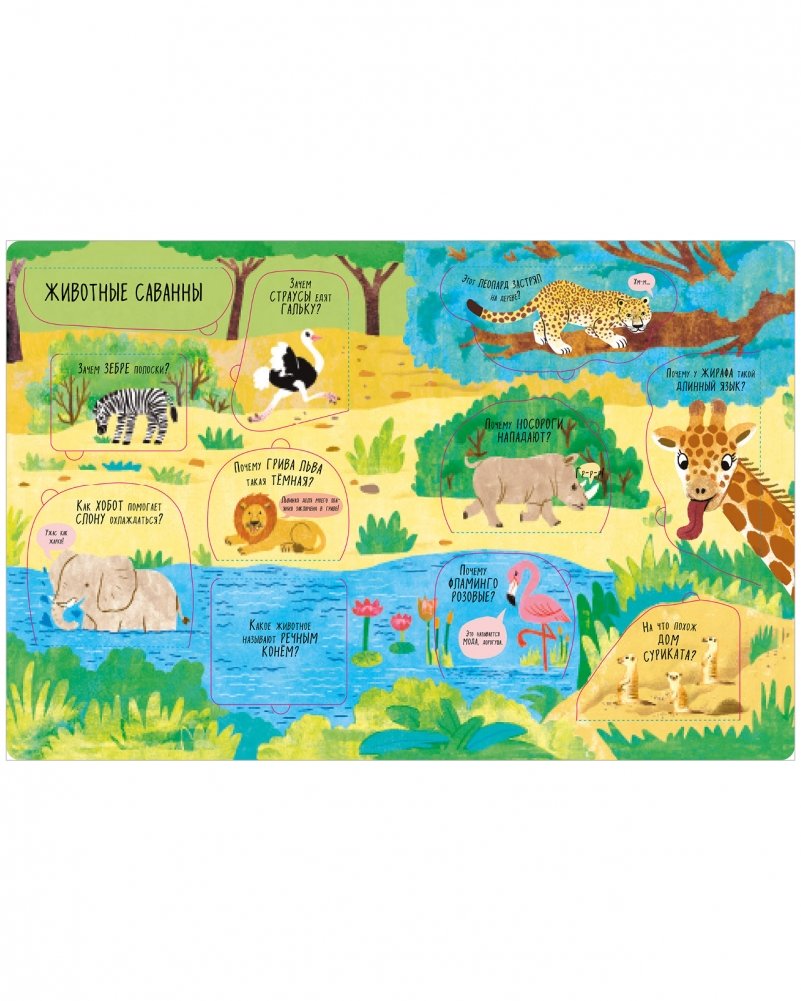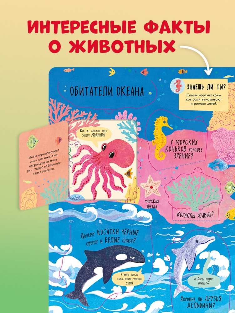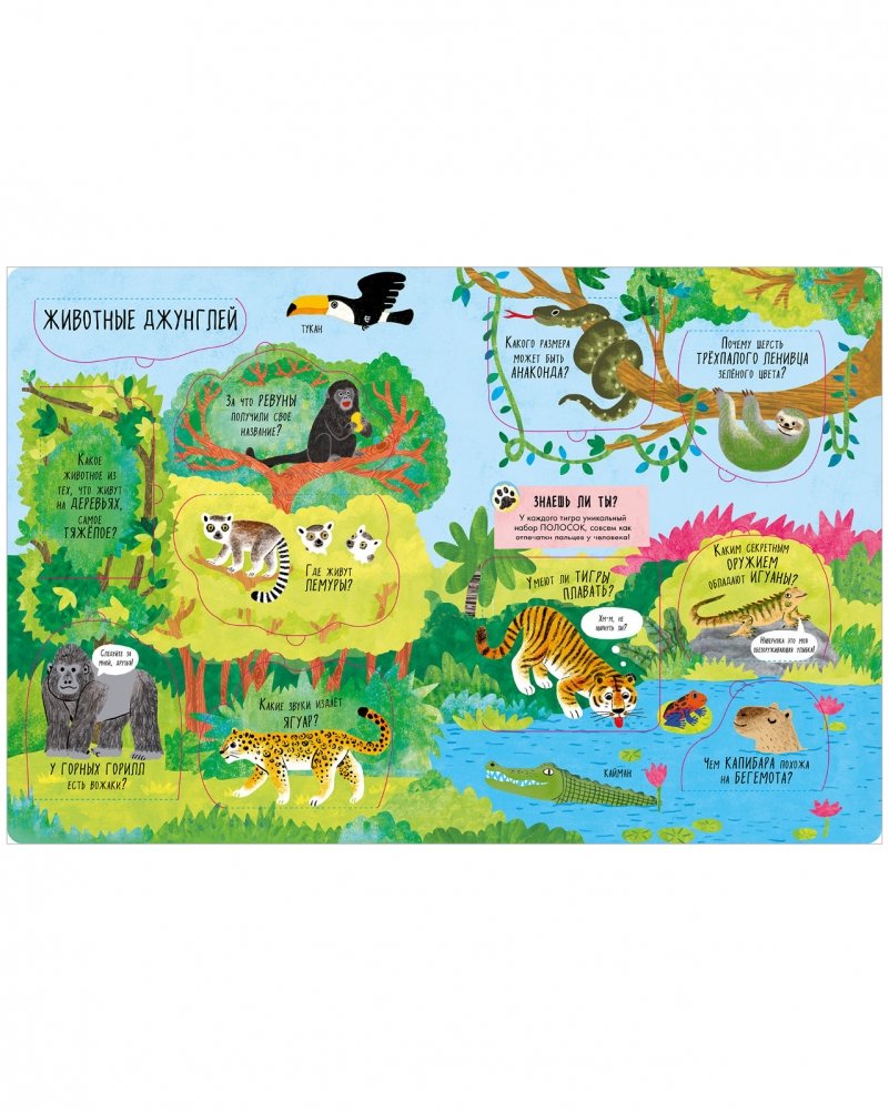 Какое животное двигается так медленно, что обрастает водорослями? Кто такой морской единорог? Какой длины может достигать гигантская змея анаконда? На эти и другие вопросы ответит «Большая книга с окошками. Животные». На каждой странице — несколько клапанов, под которыми прячутся интересные факты. Интерактивный формат книги превращает чтение в игру и еще больше вовлекает ребенка в процесс познания животного мира.