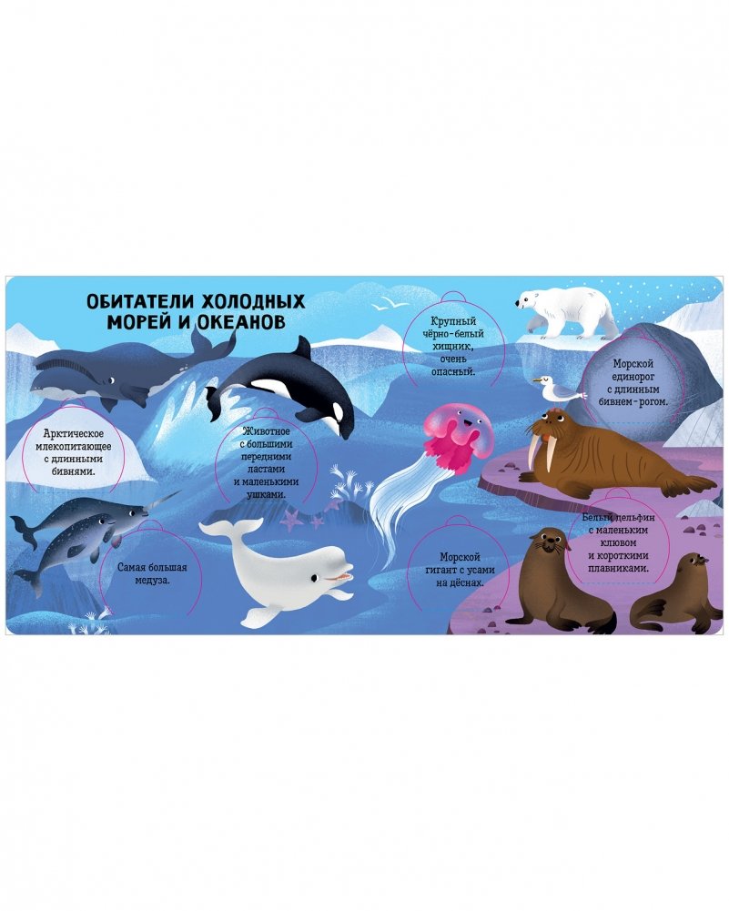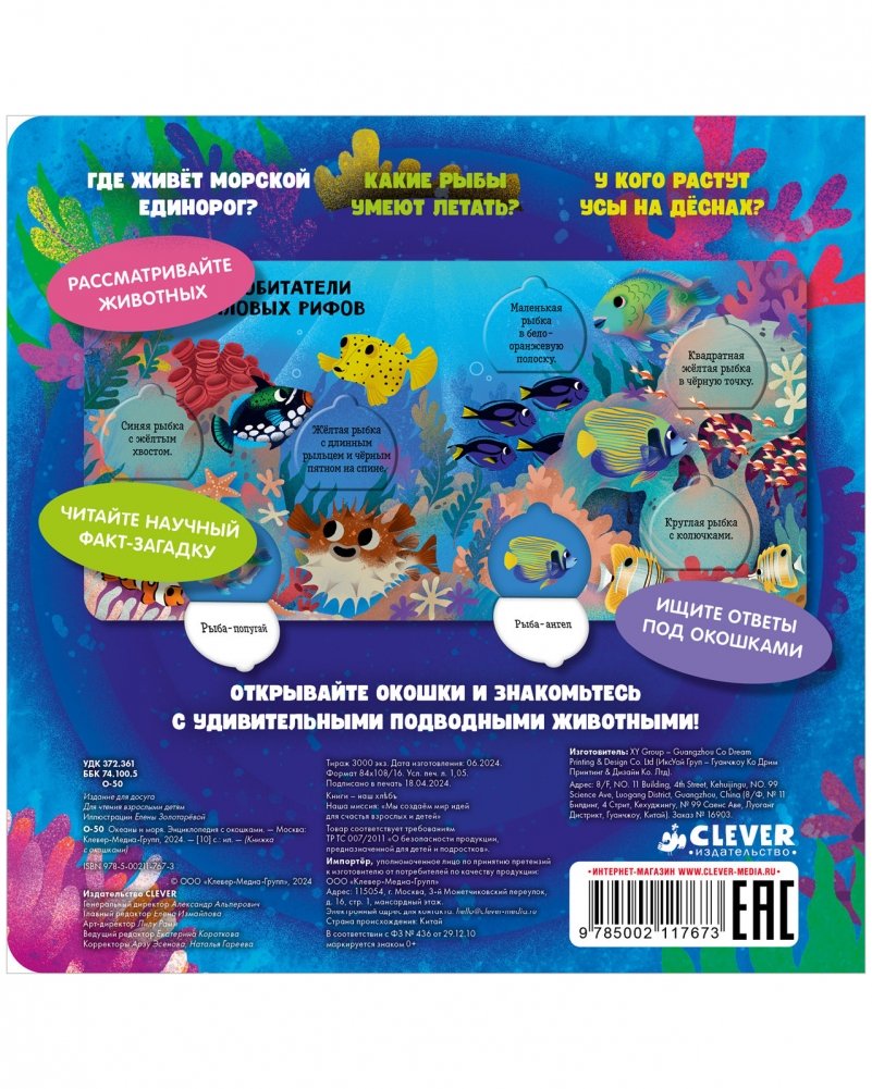 В книге пять тематических разворотов и клапаны с научными фактами-загадками, под которыми прячется картинка-ответ. Маленьких читателей ждет увлекательное путешествие к коралловым рифам, в гости к удивительным созданиям, которые притаились на дне океана, и обитателям холодных морей. Необычные морские существа, разноцветные рыбы и растения — открывайте окошки книги и узнавайте больше о самых фантастических созданиях, обитающих в воде.