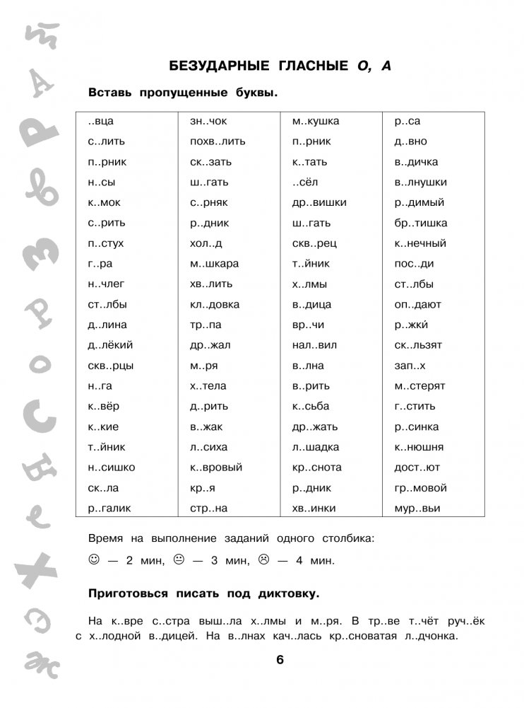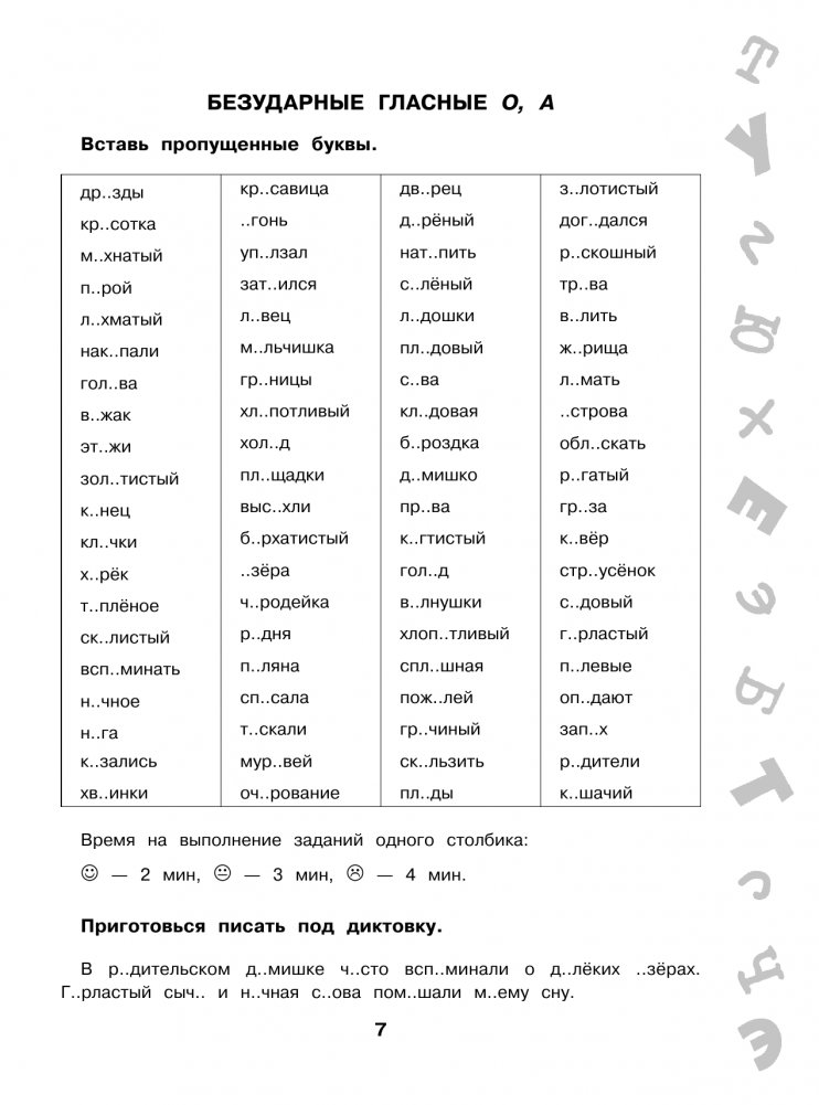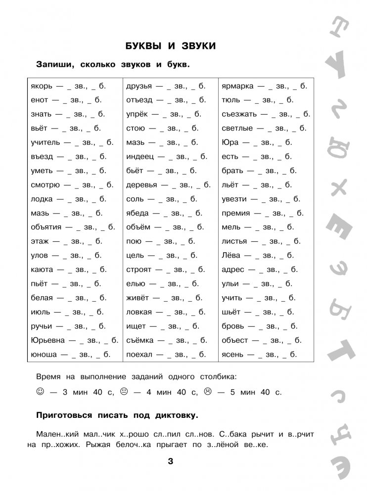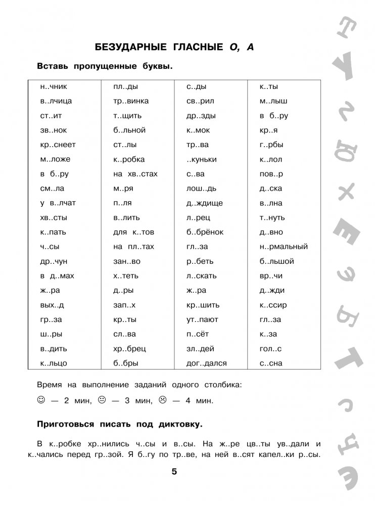 В пособие вошли задания на все орфограммы и правила, которые помогут ребёнку научиться писать грамотно и обеспечат более глубокое усвоение материала. Ребёнок будет не только вставлять пропущенную букву или знак, но и найдёт ошибки в словах, выполнит задания на время, объяснит орфограммы в диктанте, повторит правила и словарные слова, выполнит тесты.