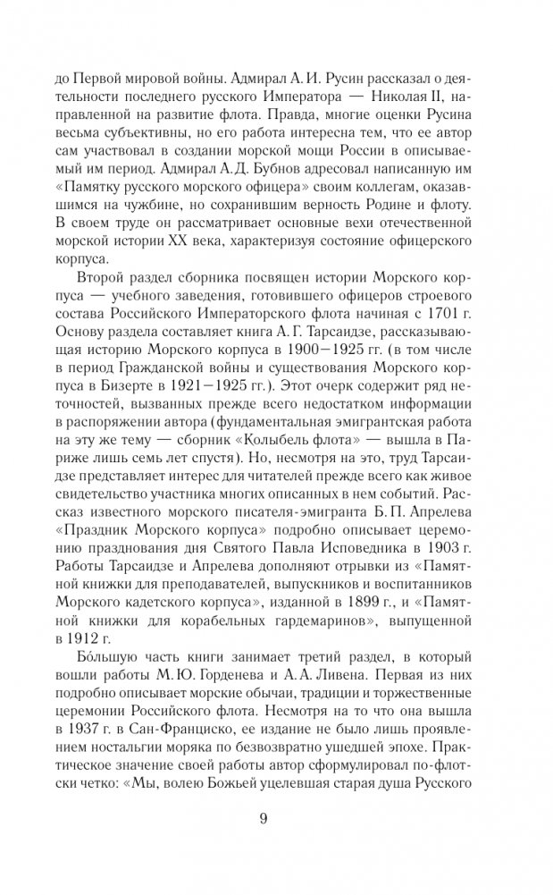"Русский Императорский флот, руководимый своим доблестным офицерским составом, завоевал для России господство на двух морях. По числу одержанных им побед он занимает в ряде флотов мира следующее место после английского. Его деятельность в течение двух веков под сенью Андреевского флага стяжала величие своей Родине". — А. Д. Бубнов.