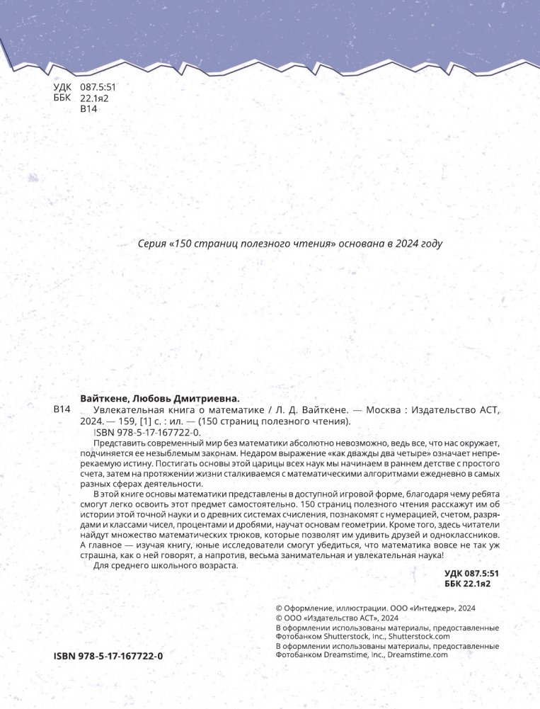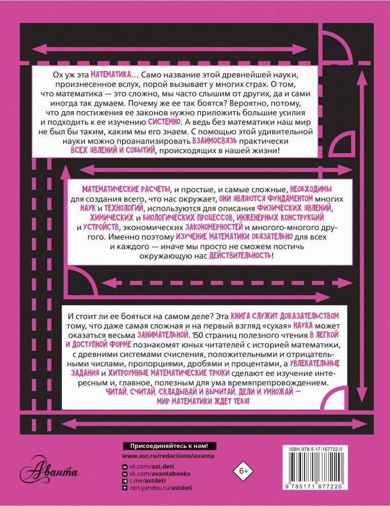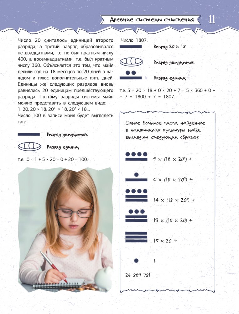 В этой книге основы математики представлены в доступной игровой форме, благодаря чему ребята смогут легко освоить этот предмет самостоятельно. 150 страниц полезного чтения расскажут им об истории этой точной науки и о древних системах счисления, познакомят с нумерацией, счетом, разрядами и классами чисел, процентами и дробями, научат основам геометрии. Кроме того, здесьчитатели найдут множество математических трюков, которые позволят им удивить друзей и одноклассников. А главное — изучая книгу, юные исследователи смогут убедиться, что математика вовсе не так уж страшна, как о ней говорят, а напротив, весьма занимательная и увлекательная наука!