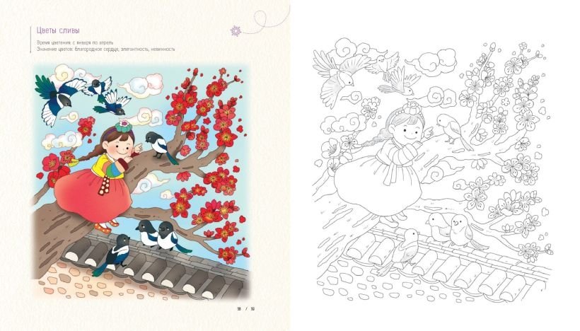 Мотивы корейской зимы украшают страницы этой раскраски. Поймайте невесомый момент уюта и спокойствия, раскрашивая прекрасные иллюстрации. Читайте подписи к изображениям и переноситесь в снежный зимний день.