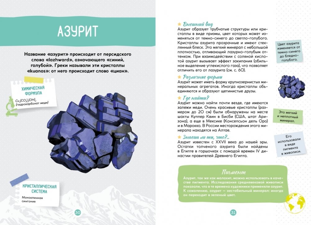 В энциклопедии представлены 33 минерала с детальными иллюстрациями и химическими формулами. Изучив все это, ты сможешь с легкостью находить и опознавать любые минералы в окружающей среде.