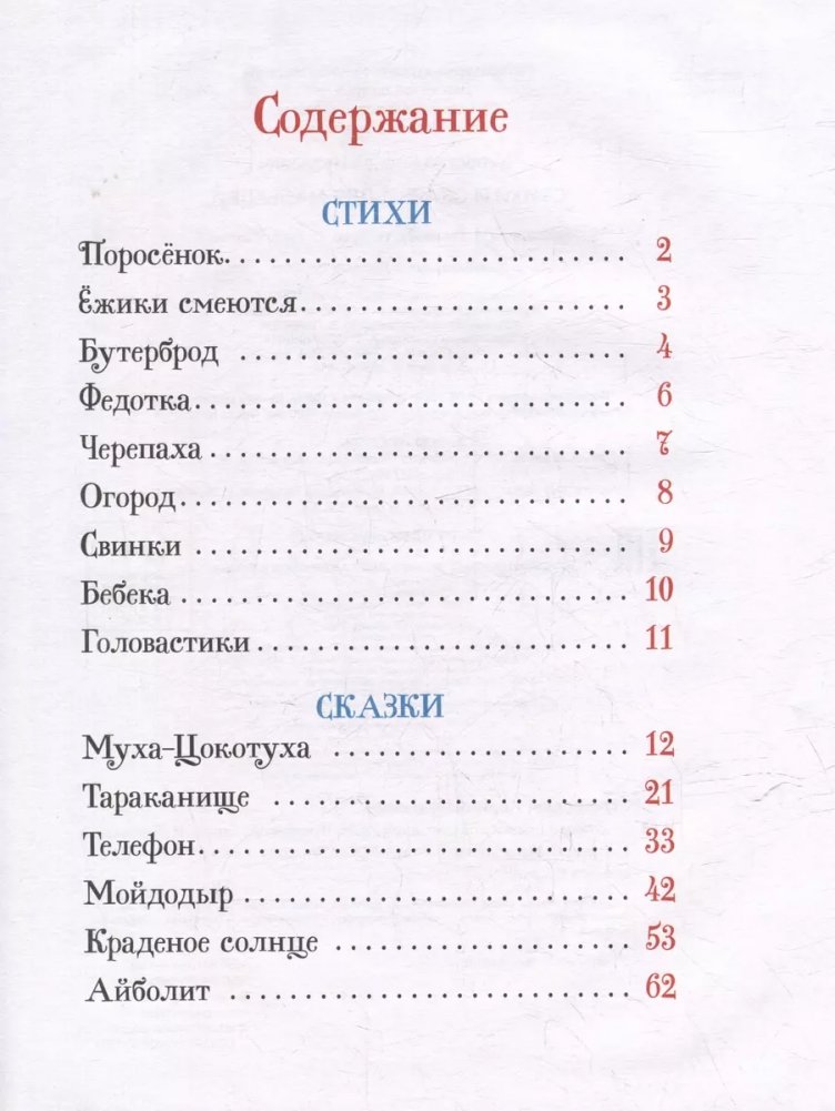 В книгу вошли стихи известнейшего детского поэта Корнея Чуковского, а также любимые стихотворные сказки — «Муха-Цокотуха», «Тараканище», «Телефон», «Айболит» и другие.