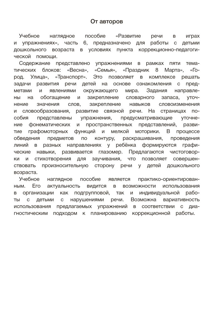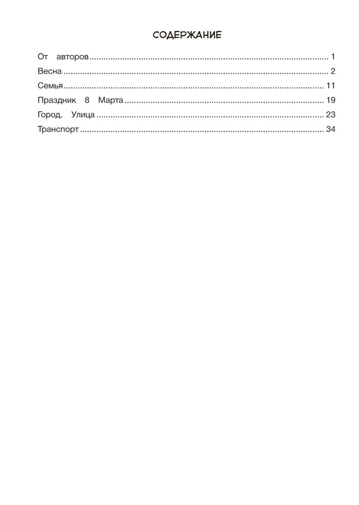 Учебное наглядное пособие предназначено для работы с детьми дошкольного возраста с нарушениями речи. Задания направлены на обогащение и закрепление словарного запаса, уточнение значения слов, закрепление навыков словообразования и словоизменения, развитие связной речи. Содержание пособия охватывает пять тематических блоков: «Весна», «Семья», «Праздник 8 Марта», «Город. Улица», «Транспорт».