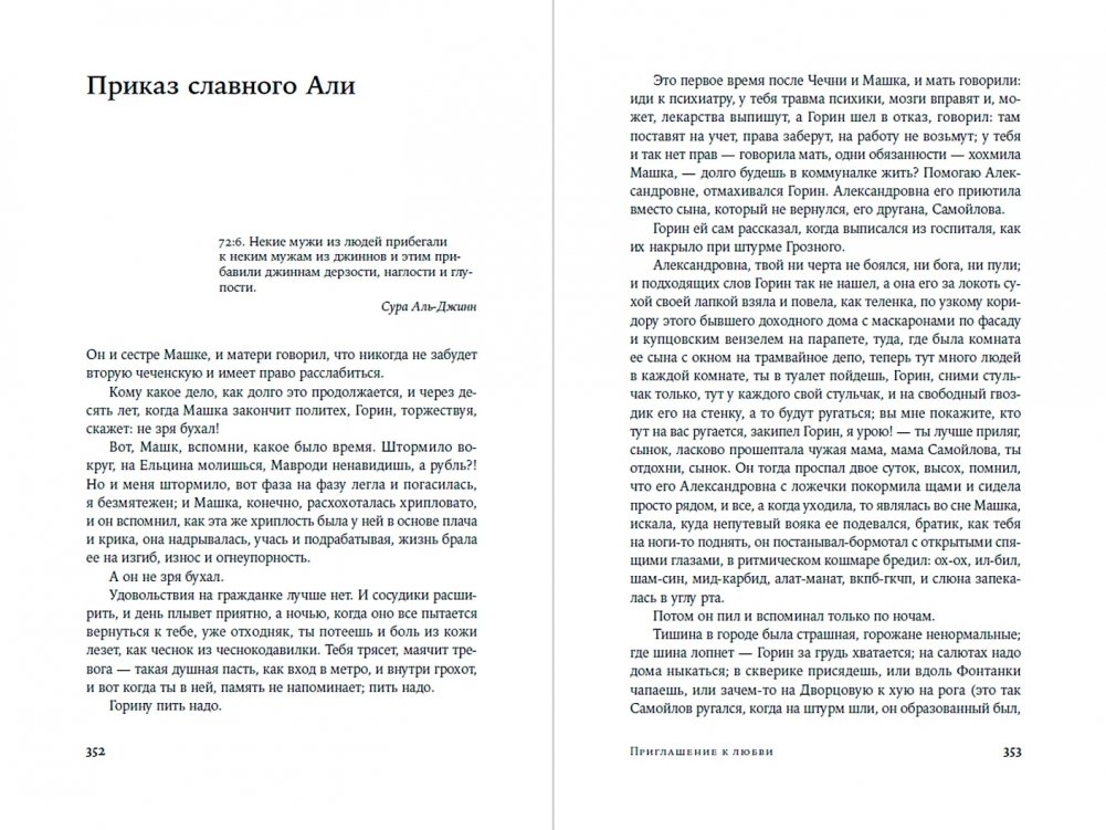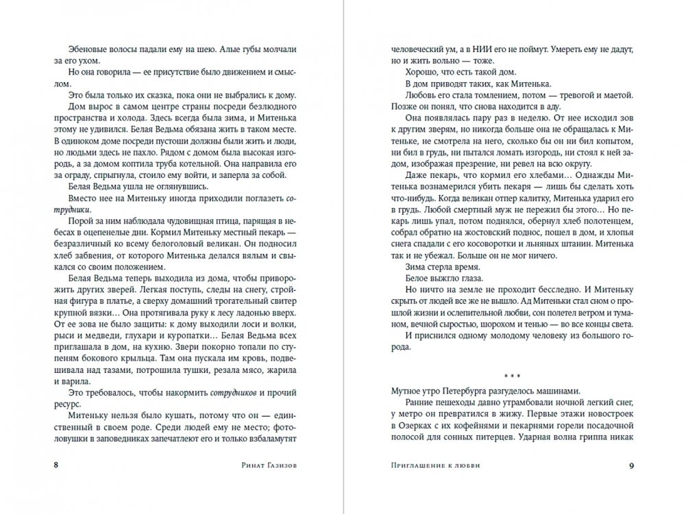 Каждый текст цикла «Приглашение к любви» имеет свой внутренний сюжет и развивает общий сюжет книги, каждый написан в особой манере и собственном жанре: магический реализм, производственная проза, абсурд, научная фантастика, бытовая зарисовка, хоррор и т. д. Но эти особенности не мешают автору выстраивать цельную конструкцию, завораживающую в неожиданных метафорах и твистах. Сквозные герои взаимодействуют в атмосфере линчевского «Твин Пикса»: живут в лимбе между жизнью и смертью, работают на таинственный Аппарат, встречают мифических персонажей и, даже обладая сверхчеловеческими способностями, остаются людьми с обычными недостатками и желаниями.
