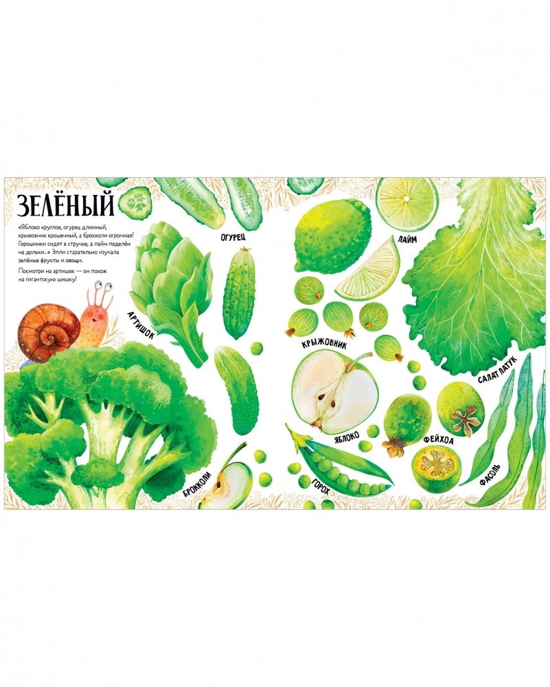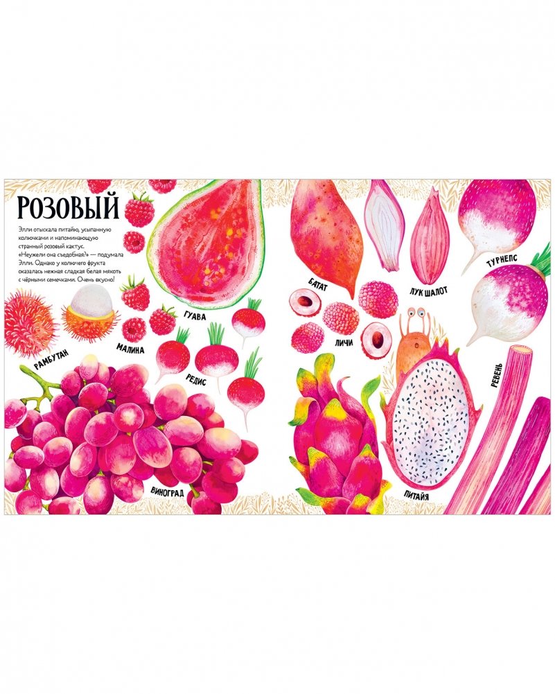 Книга выглядит как визуальный словарь — под каждым рисунком подпись с названием клубники, смородины, банана... Здесь есть не только всем известные яблоки, груши и огурцы, но и редкие артишок и турнепс, и экзотические рамбутан, мангостин и питайя.