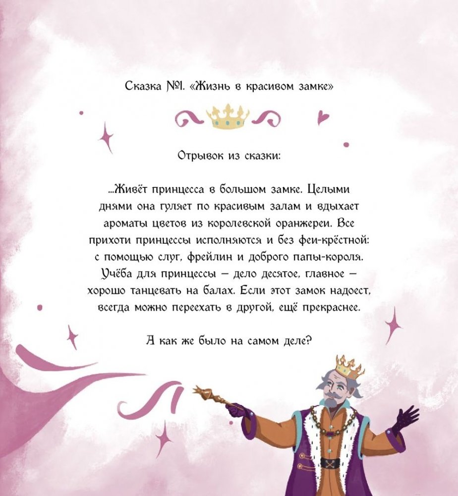 Представь себе, что ты встретилась с феей. И она может одним взмахом волшебной палочки превратить тебя в настоящую принцессу! Хочешь? Подожди-подожди, не торопись с ответом! Сначала прочитай эту книгу и подумай, готова ли ты к жизни во дворце? Там, между прочим, довольно холодно и не очень чисто… И совсем нет конфет! С принцами тоже не всё так просто, как показывают в мультфильмах. Тебе придётся учиться - и не только музыке и танцам. А если простудишься, лечить тебя станут пиявками и холодными ваннами. Но может быть, сейчас принцессам живётся легче? Об этом мы тоже расскажем: ведь и в наше время им нужно ежедневно много трудиться - королевский титул оказывается нелёгкой ношей. Для среднего школьного возраста.