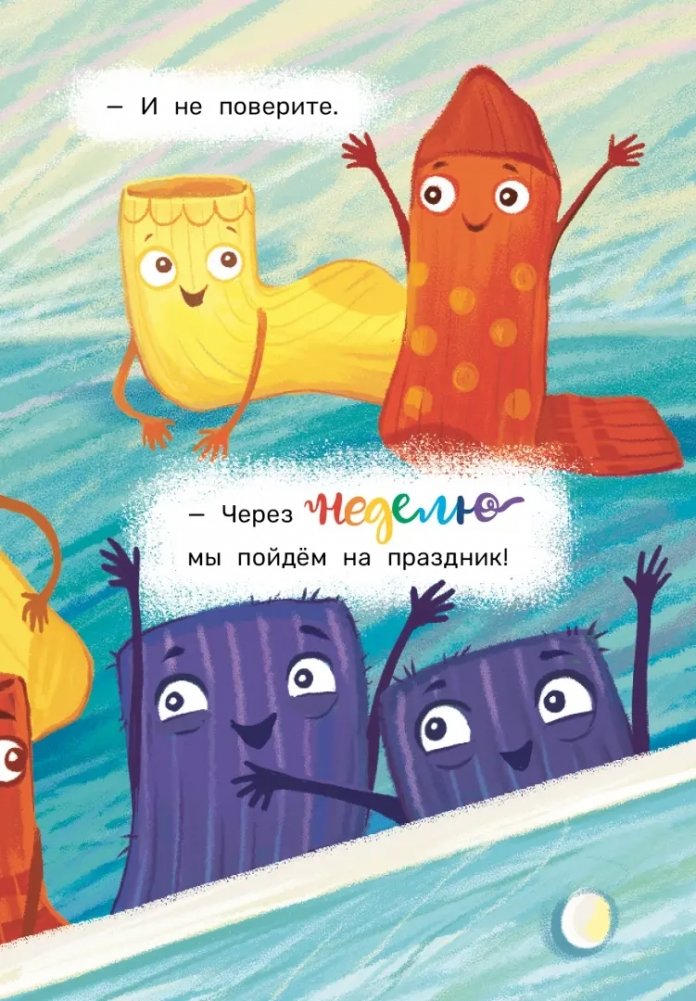 Отчего в шкафу случился переполох? Это носки только что вернулись из большой стирки! Им предстоит решить, кто отправится на праздник в следующий понедельник. Кажется, без помощи маленьких читателей они не справятся. Впереди ответственная задача: необходимо подключить логику и внимание, вспомнить дни недели и цвета, найти верные пары и потренировать счёт. Скорее отправляйтесь в яркое приключение!
