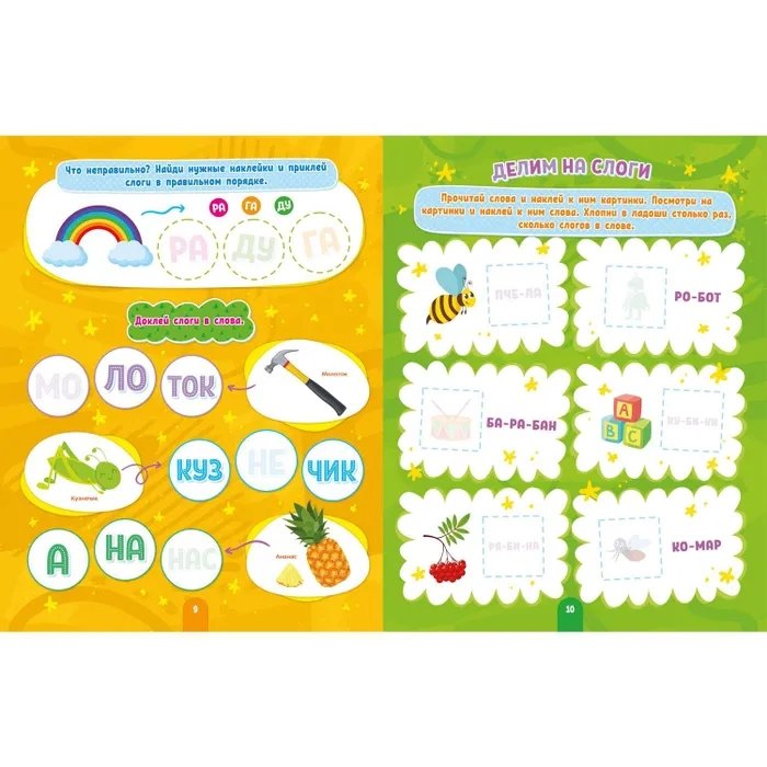 Дети наклеивают картинки, буквы и цифры и в увлекательной форме учат алфавит, осваивают счёт, тренируют логику и узнают много нового об окружающем мир.