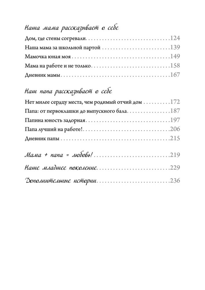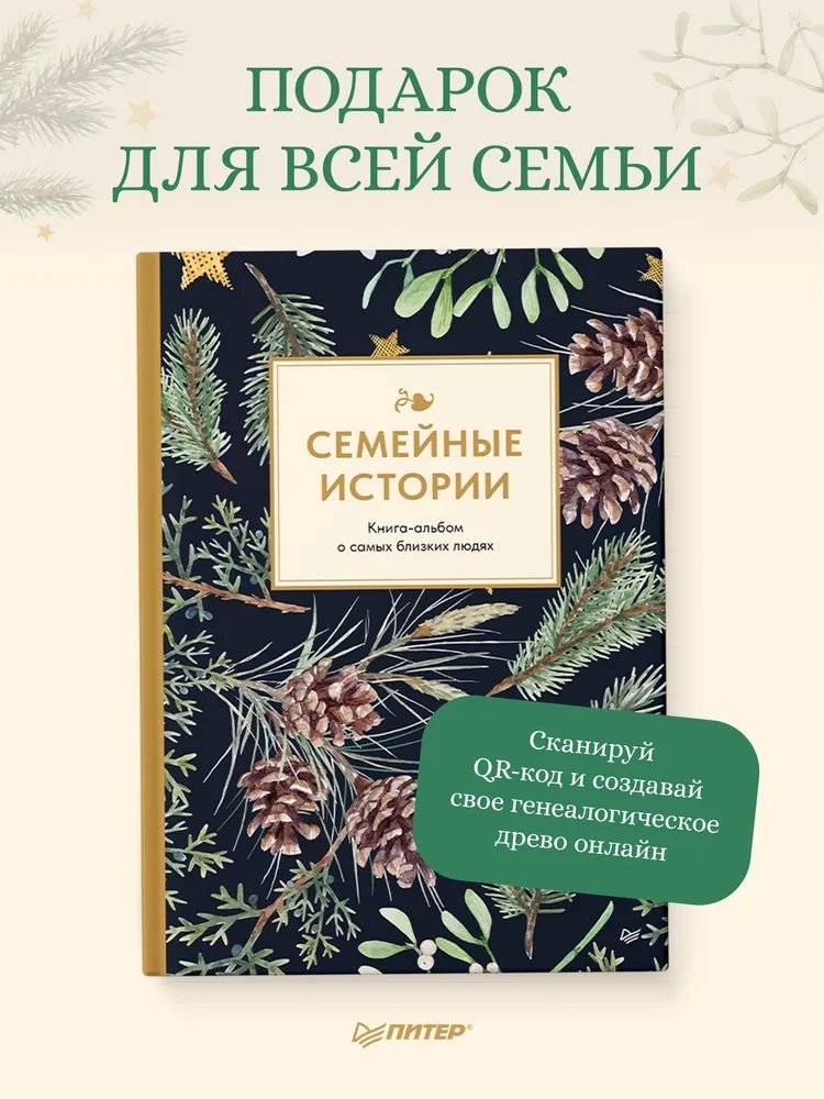 Все счастливые семьи похожи… В каждой семье должны быть истории, которые передаются из поколения в поколение. Ведь это такая ценность — узнать рецепт вкусных блинчиков от прабабушки и сохранить его для своих внуков, записать смешные присказки прадедушки, показать фотографии бабушки в молодости, поделиться забавными шалостями, которые совершал папа в младенчестве, запечатлеть и сохранить трогательные моменты из собственного детства. Книга-альбом «Семейные истории» позволит сохранять и передавать семейные традиции и советы старшего поколения. Это незаменимый подарок для вашей семьи и вдохновение для будущих поколений. Заполняйте ее всей семьей, не стесняйтесь, веселитесь, болтайте, секретничайте за чашечкой чая, превратите этот процесс в удовольствие. А чтобы не запутаться в ветвях вашего генеалогического древа, сканируйте QR-код, расположенный внутри, и переходите на сайт Famiry.ru. Станьте тем человеком, который поможет сохранить ценные истории своей семьи.
